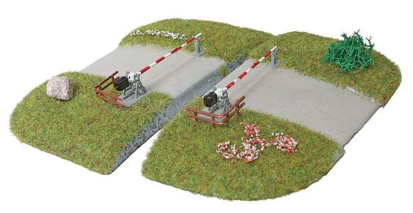 Переезд со шлагбаумом для радиусных рельс, с элементами ландшафта