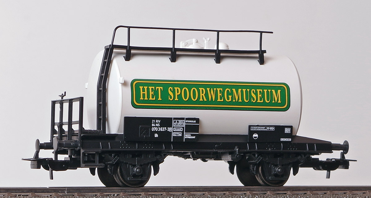 Двухосная цистерна HET SPOORWEGMUSEUM. Принадлежность NS, Нидерланды. NEM-шахты для установки сцепок. Сцепки с накидной петлей. Металлические колесные пары. Производство PIKO (современное), артикул 96062.